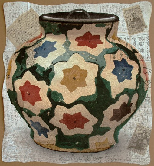 Description: Daniel’s print of a pot shows a 1700 ceramic vessel by Kenzan Ogata, in the Smithsonian Collection. A bold design with softly textured collage and warm colors.