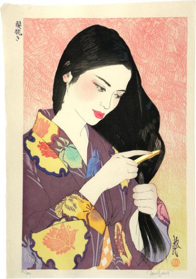 Description: The mauve-purple kimono offsets the patterns of irises and butterflies, and includes subtle bokashi or shading in the flowers. Details include 22-carat gold leaf on the comb, lacquer printing in the hair, and extensive embossing to suggest the fabric of the kimono. The pink baren ’sujizuri’ background melts into hints of yellow, reflecting the tones of the kimono motifs. These effects have been achieved with 34 printings, including embossing and gold leaf.