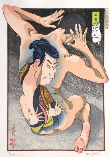 Description: A young male model twists his body and spreads his hands to echo the dynamic image tattooed on his back, which is based on Tōshūsai Sharaku’s famous half-length portrait of Ōtani Oniji III (1794). The mask in the title cartouche is a caricature of the face of the famous Kabuki actor Ichikawa Ebizō V. Beneath the artist’s signature is a rebus of the artist’s own face, comprising the stylized shapes of the letters of his fullname in English.