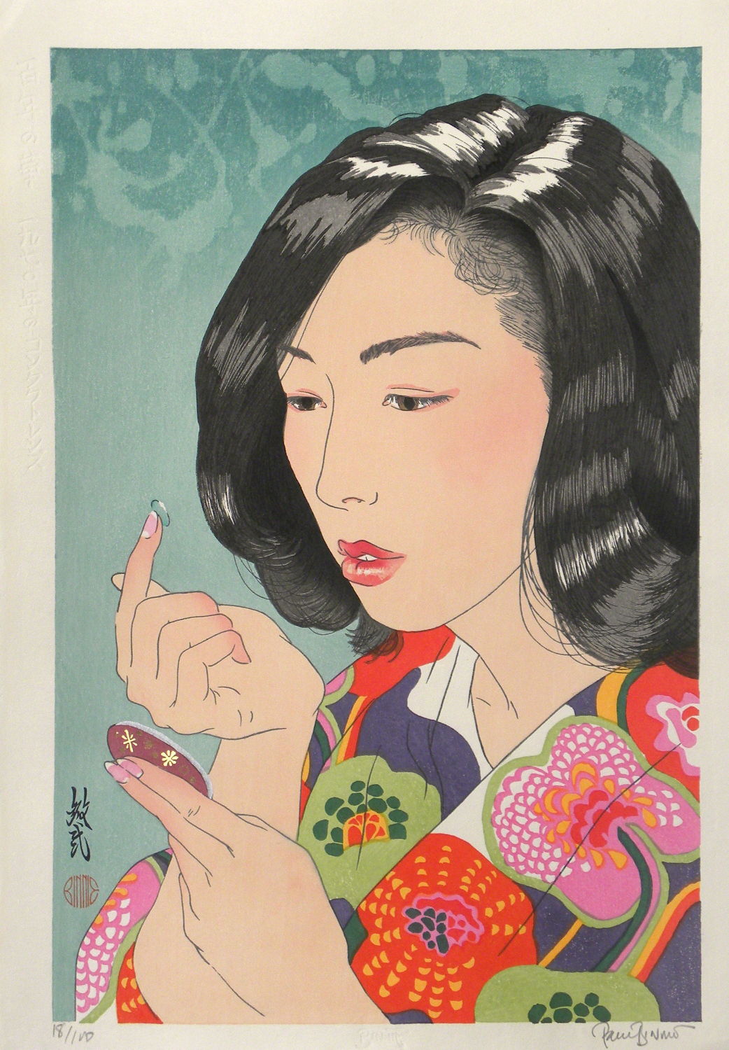 Details, highlighted in bronze, 23 carat gold leaf, and silver and white mica metallic pigments. Series title and print title in karazuri (’blind-printing’) on the upper left margin; signed in kan-ji, Bin-ni lower left followed by red artist’s seal Binnie, and numbered and signed in pencil on the bottom margin. There were 53 printings, including a new technique in the shaded background; i.e. a special block was cut for the upper area and splattered with oil varnish, which when dry, resisted the water-based ink in an irregular way. Each impression is therefore different in this regard, some showing the resist strongly, others showing the shading more.