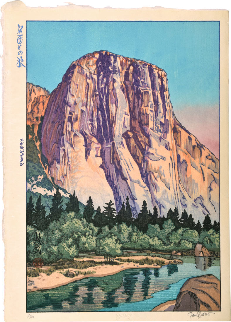 Description: A large oban print of El Capitan, in Yosemite Valley in California, is the ninth design in Paul Binnie’s ongoing series, Travels with the Master (Meisho to no Tabi), through which Binnie revisits sites depicted by respected Japanese painter and printmaker Yoshida Hiroshi (1876-1950). Yoshida visited Yosemite in 1924 and released his woodblock print in 1925. Binnie utilizes 34 colors on hand-carved cherry wood and other wood blocks to depicts the cliff from the south-west, near the Merced River in the foreground, whereas Yoshida viewed the cliff from further east. Binnie's print depicts the warm afternoon light of a September day, with much of the foreground in shadow but the upper cliff in warm sunlight and colorful reflections in the river.