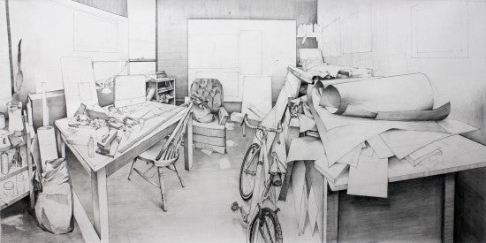 Desc: Drawn over 6 months, this wall-sized view depicts the interior of my graduate studio at Indiana University.