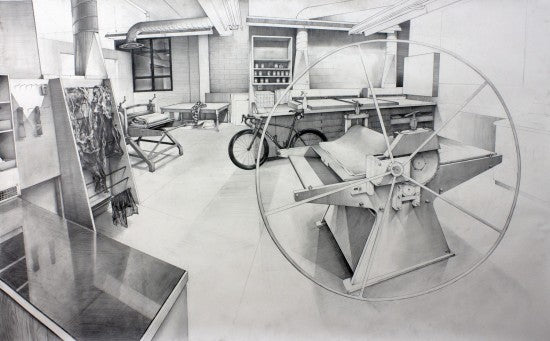 Desc: One of several large drawings from my MFA thesis, this is the graduate intaglio studio at Indiana University.