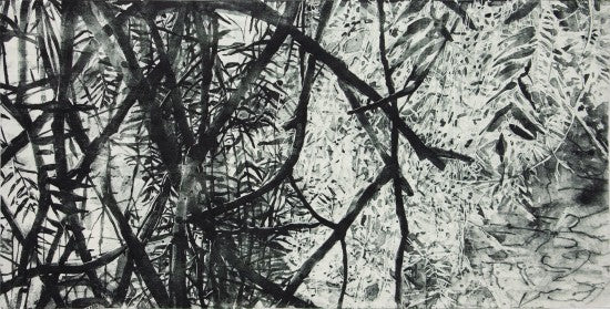 Description: The images in this series were made during a 2022 residency in Spain. Desmai is the Catalan language name of the trees depicted. Mokulito refers to the print technique developed in the 1970’s by Professor Seishi Ozaku in Japan. The process adapts the principles of lithography but employs plywood rather than a stone plate. It combines the beautiful tonal gradations possible with lithography materials with the crisp cut marks of woodcut.